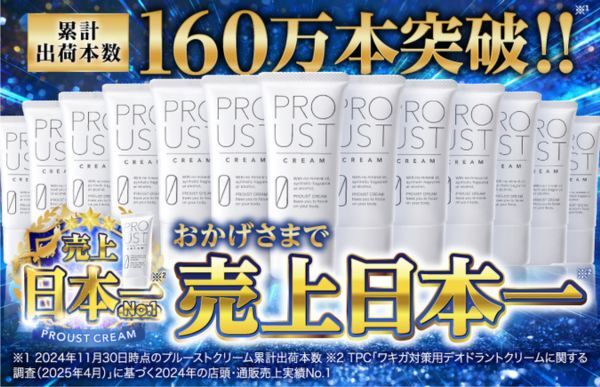 ※1:2024年11月30日時点のプルーストクリーム累計出荷本数。※2:2023年3月17日~4月7日実施プルーストクリームの定期ご利用中のお客様(定期回数3~10回のお客様172名)へのアンケート調査結果(自社調べ)