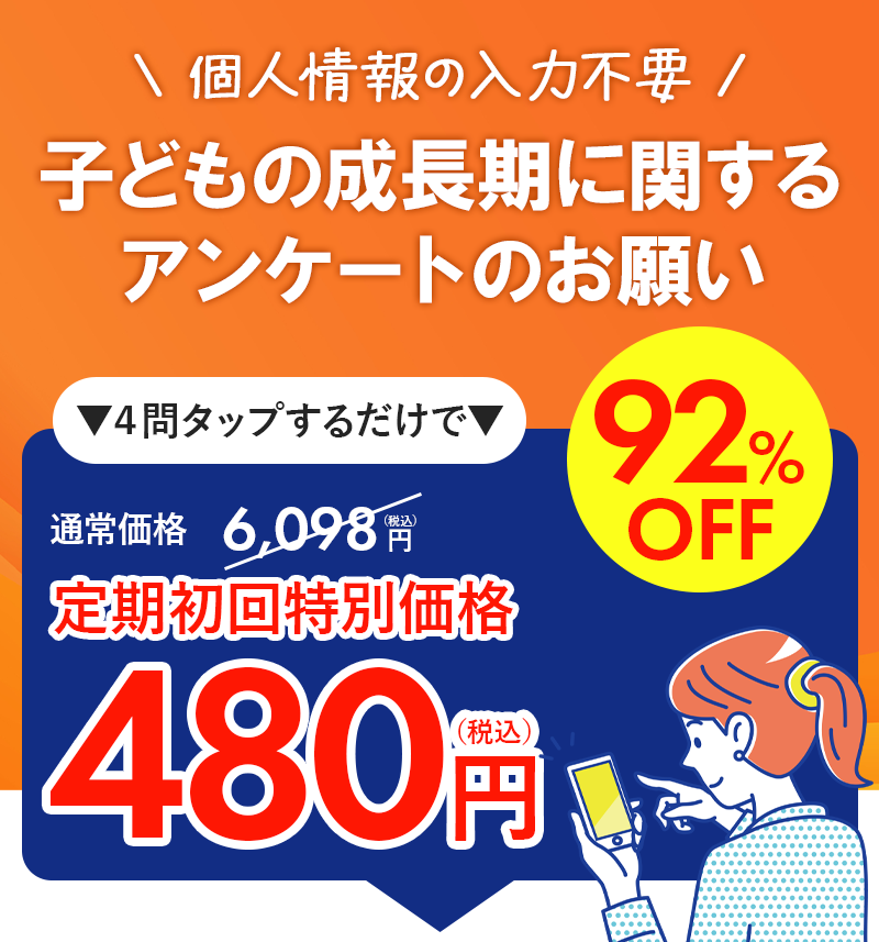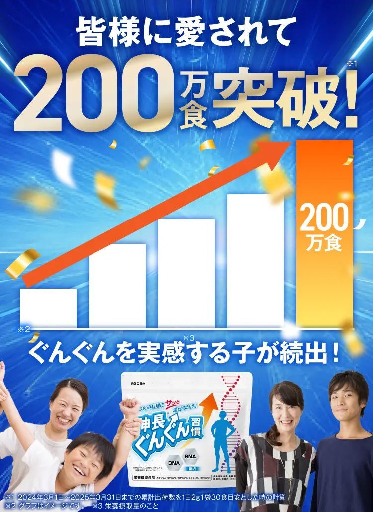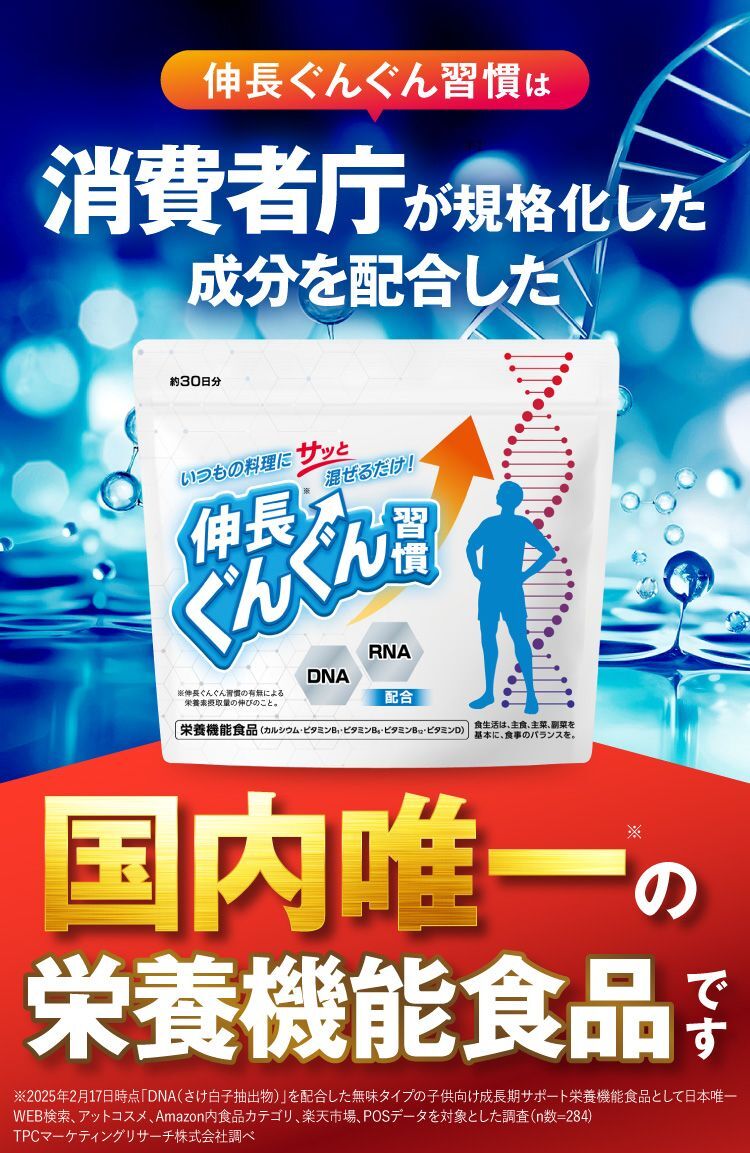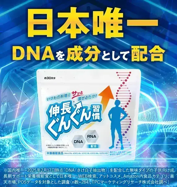 ※2:※2025年2月17日時点「DNA(さけ白子抽出物)」を配合した無味タイプの子供向け成長期サポート栄養機能食品として日本唯一